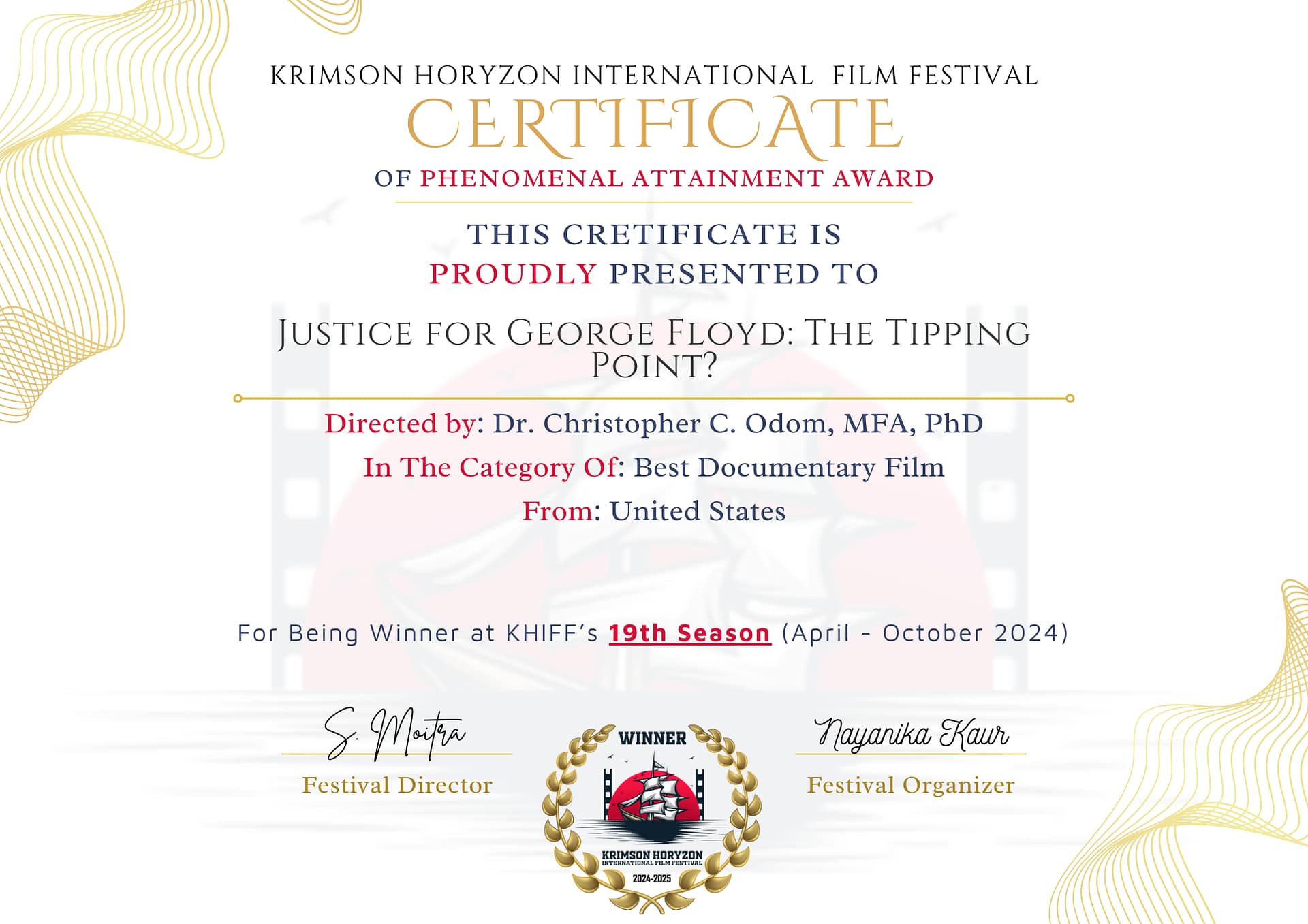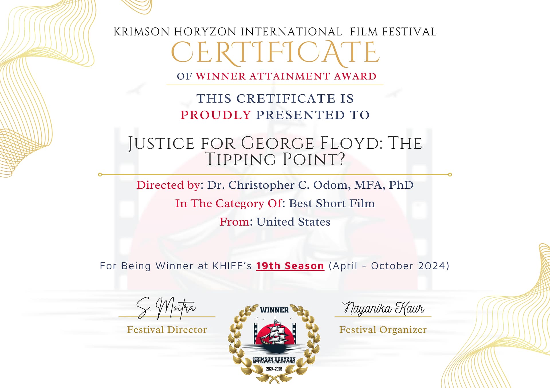 India – The independent international and domestic multi-award-winning short documentary film, “Justice for George Floyd: The Tipping Point?” snatched victory wins in India again for Best Documentary Film, Best Short Film, and Best Director at the Krimson Horyson International Film Festival.